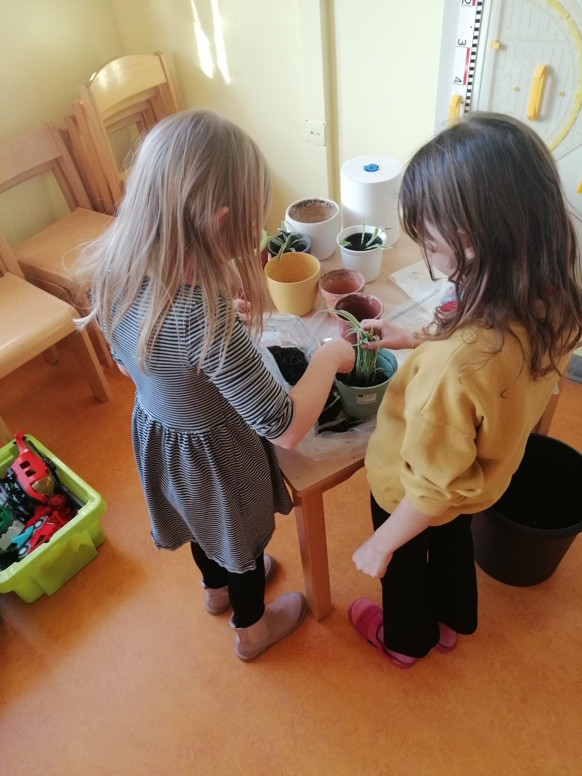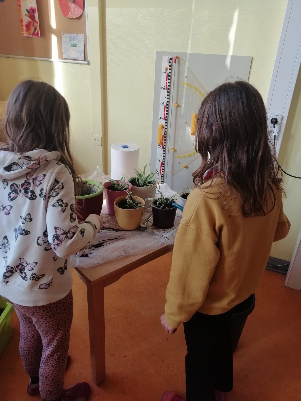 In den letzten zwei Wochen wurde das mit den Kindern der Notbetreuung in der unteren Etage umgesetzt, natürlich auf Abstand und mit Maske.