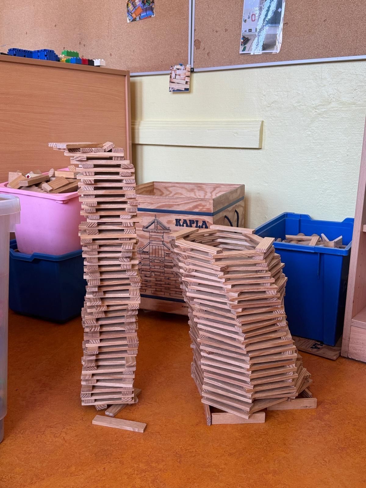In unserem Bauraum haben unsere Schüler und Schülerinnen die Möglichkeit, aus unterschiedlichsten Materialien, gestalterisch aktiv zu werden. Stecksysteme, Kappla, Lego, Holzbausteine, die Murmelbahn und weitere Elemente werden hier gerne genutzt. Die Bauwerke der SuS dürfen bis zu zwei Wochen bestehen, verändert und erweitert werden bevor sie an fest gelegten Tagen gemeinsam abgebaut werden um Platz für Neues zu schaffen.